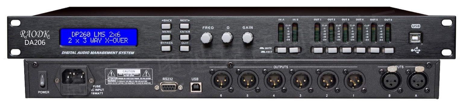 DA系列是一台功能强大,便于操作的处理器。采用开关电源设计,能自动调整90伏至250伏之间的外电输入,能在世界的任何地方应用,而无须作调整。数字信号处理器采用高精度的DSP芯片48bit的内部数据处理,具有极高的动态范围及优秀的音质。2进6出处理器,预设多分频模式:2X2+2分频,2X3分频,4+2分频,5+1分频和6分频模式。同时每个输出通道的信号源可任意选择。每个通道包括:增益,参量均衡器,分频,延时,相位,限幅器共有20个用户存储模式,通过RS232或USB接口,连接计算机专用软件控制。
